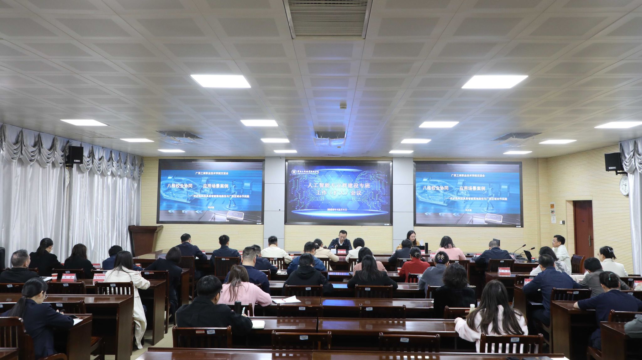 • 為加快我校人工智能相關(guān)項(xiàng)目落地見(jiàn)效,2025年12月1日,學(xué)校在鵬飛校區(qū)召開(kāi)人工智能專業(yè)群建設(shè)專班工作(擴(kuò)大)會(huì)議。學(xué)校校長(zhǎng)劉進(jìn)出席會(huì)議并作工作部署,學(xué)校副校長(zhǎng)鄭華主持會(huì)議。會(huì)議現(xiàn)場(chǎng)劉進(jìn)在會(huì)議上肯定了專班...