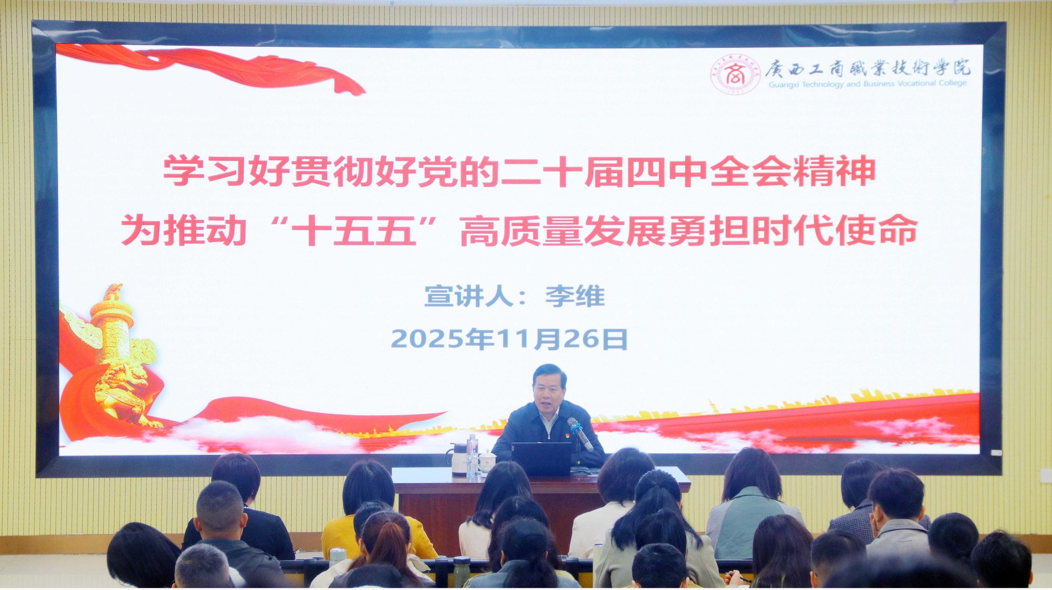 • 為深入學(xué)習(xí)貫徹黨的二十屆四中全會(huì)精神,準(zhǔn)確把握黨中央對(duì)“十五五”時(shí)期發(fā)展的戰(zhàn)略部署,統(tǒng)一思想、凝聚共識(shí),2025年11月26日,學(xué)校黨委書(shū)記李維在武鳴校區(qū)為師生宣講黨的二十屆四中全會(huì)精神。黨委組織部(學(xué)院...