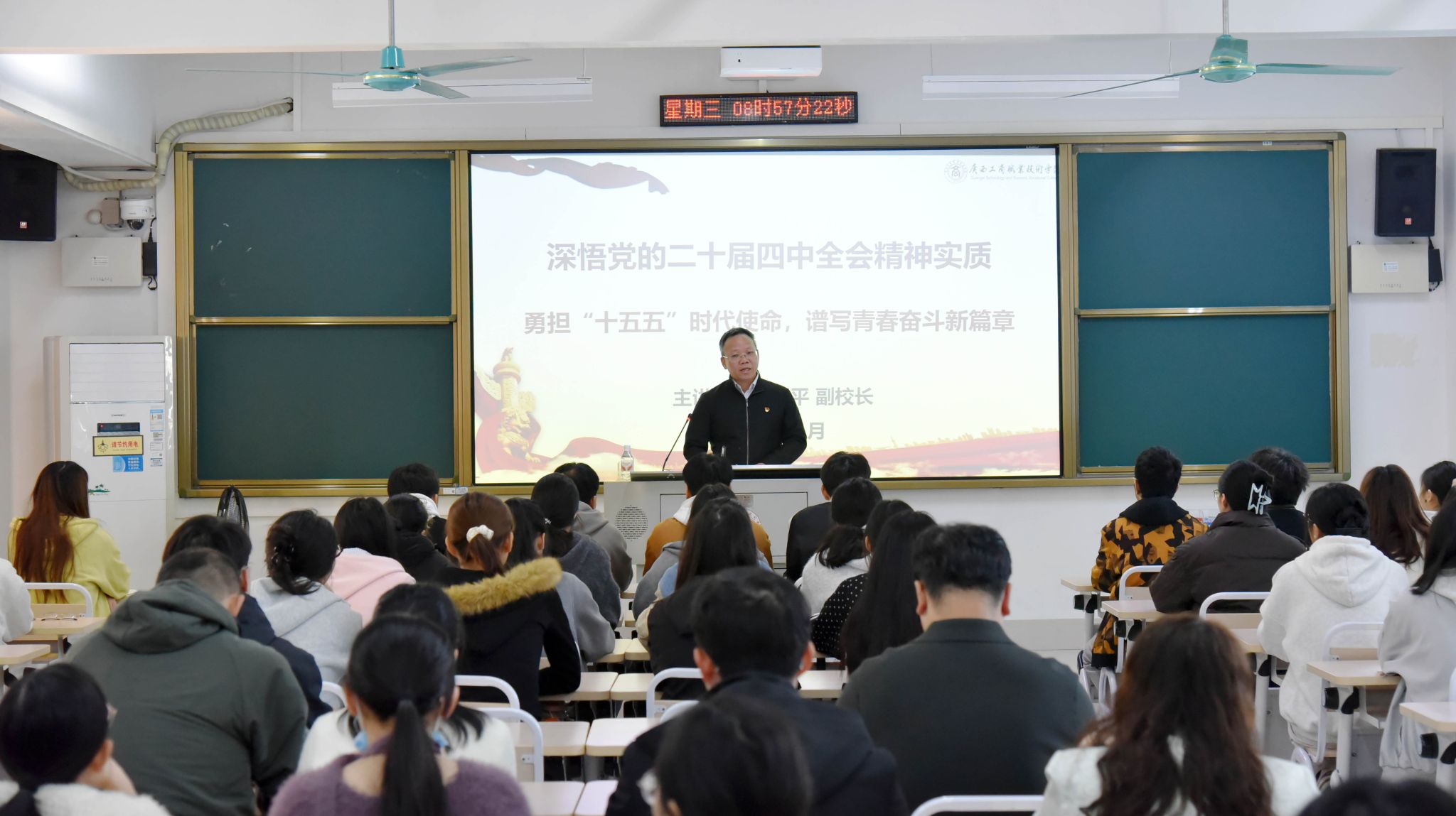• 11月24日,學(xué)校校長(zhǎng)劉進(jìn)在鵬飛校區(qū)為青年團(tuán)員代表開(kāi)展黨的二十屆四中全會(huì)精神專題宣講。本次宣講聚焦黨的二十屆四中全會(huì)精神,系統(tǒng)回顧“十四五”時(shí)期我國(guó)的輝煌成就,展望“十五五”規(guī)劃前景,并結(jié)合學(xué)校育人目...