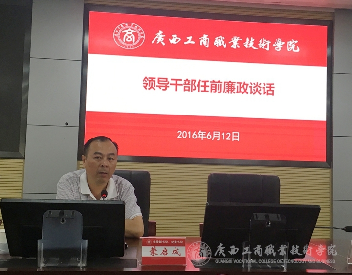 • 2016年6月12日下午,學(xué)院黨委副書記、紀(jì)委書記蒙啟成同志對6位新調(diào)整工作崗位的處級干部做任前廉政談話。會(huì)上,蒙啟成對6位處級領(lǐng)導(dǎo)干部提出了四點(diǎn)要求:一是認(rèn)真履行黨風(fēng)廉政建設(shè)“一崗雙責(zé)”責(zé)任,管好自己部門...