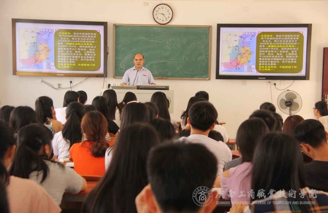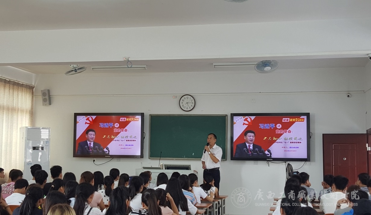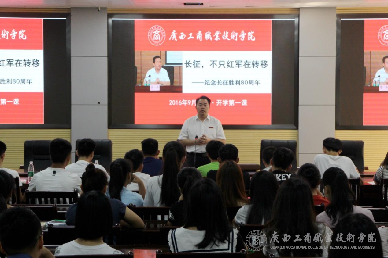 • ?????? 秋風(fēng)送爽,金桂飄香。2016年9月19日,廣西工商職業(yè)技術(shù)學(xué)院16級新生迎來了開學(xué)第一課。學(xué)院黨委書記覃武云走上了開學(xué)第一課的講臺(tái),為會(huì)計(jì)1609班、1610班一百多位新同學(xué)上了一堂生動(dòng)、精彩的思政課。覃書...
